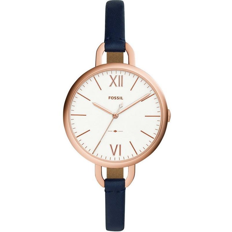 Brand: Fossil; Collection: Annette; Product code: ES4355; Type of article: Watch; Gender: Lady; Functions: Time-only; Type of Movement / Mechanism: Quartz - Battery; Case Shape: Round; Case Material: Stainless Steel; Case Color: Rose Gold; Case Diameter Ø: 36 mm; Type of Dial: Analog; Color of the Dial: White; Strap Material: Leather; Strap Color: Blue; Water Resistance: 30 meters / 3 bar.